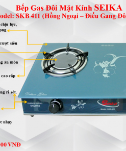 + Bếp Gas Đôi Mặt Kính Seika (Hồng Ngoại Ø 120) SKB411 – Hàng Chính Hãng có thiết kế nhỏ gọn, dễ dàng phù hợp với nhiều không gian bếp, ngoài ra với bề mặt kính luôn sáng bóng, dễ dàng vệ sinh sau khi sử dụng cùng họa tiết và màu sắc nổi bật.