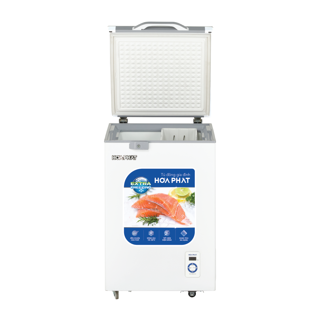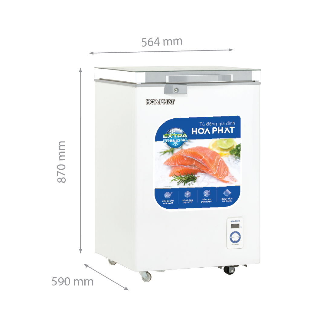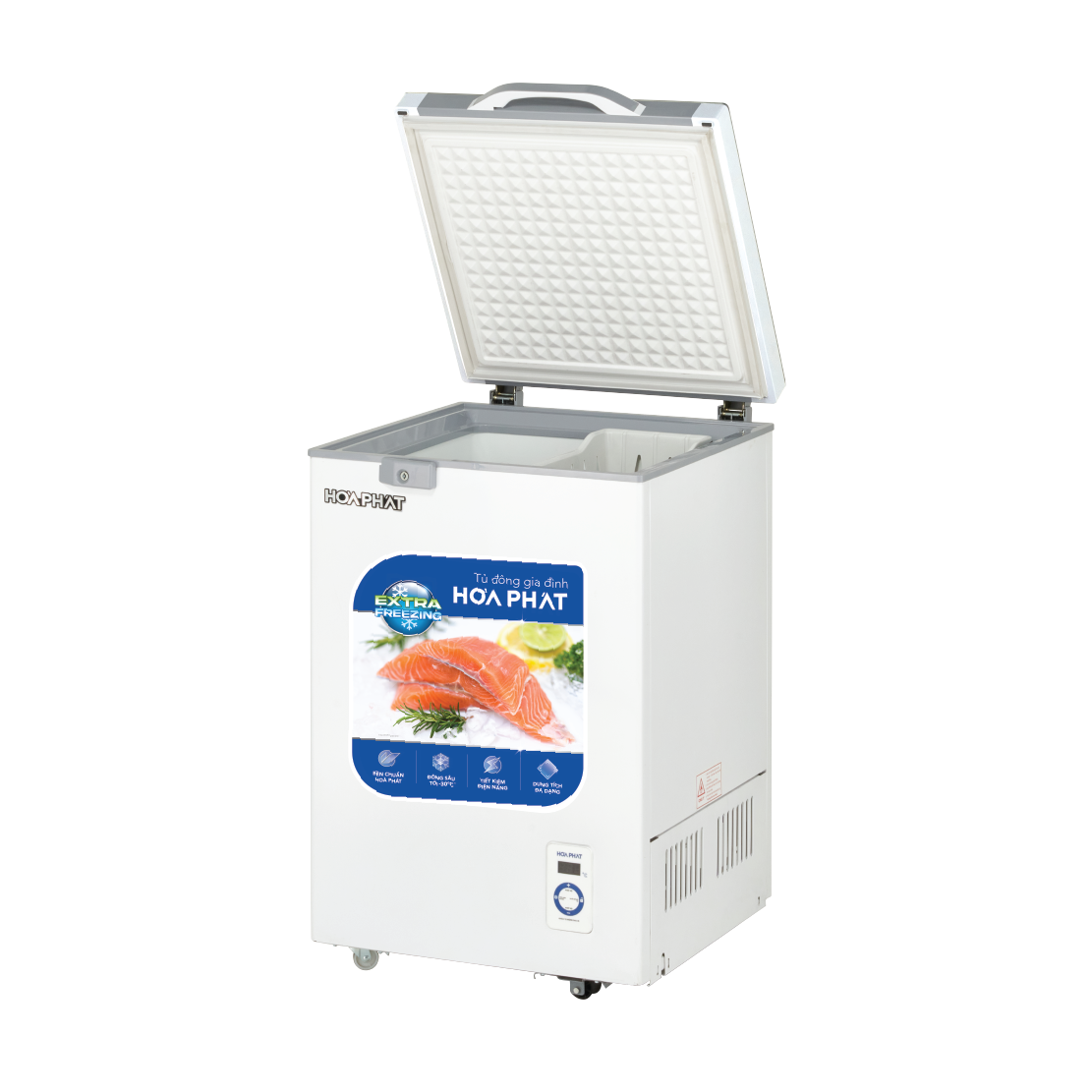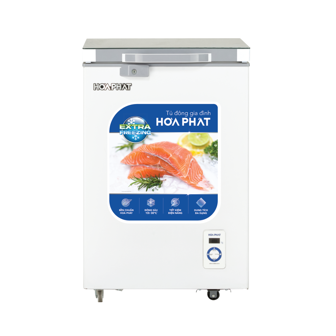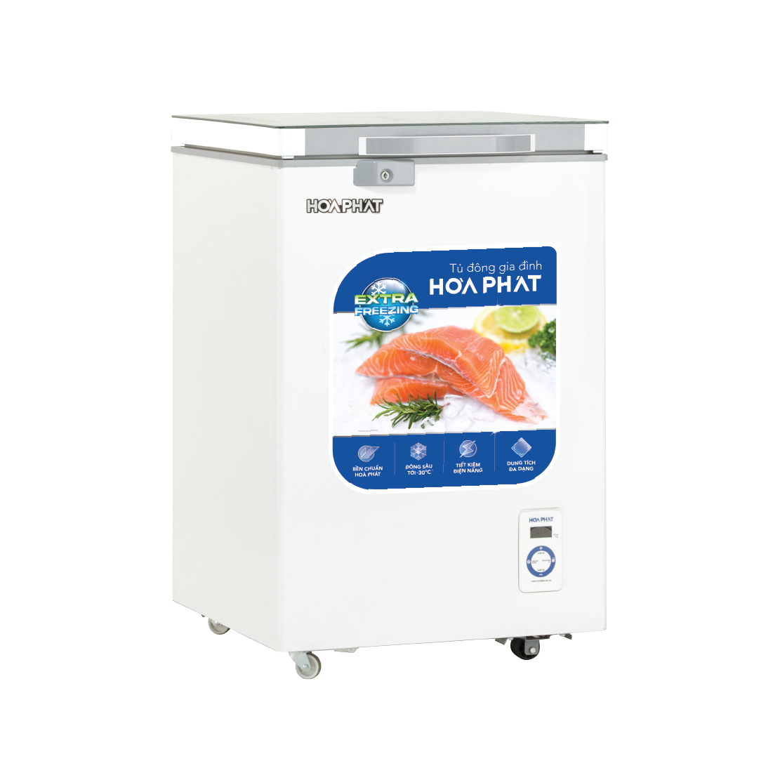 Tủ đông Hòa Phát cánh kính 1 ngăn 1 cánh HPF AD6107.T1 sở hữu công nghệ Extra Freezing đông sâu tới -30 độ C, dàn máy nén khoẻ và hệ thống chống thoát hơi lạnh với lớp bảo ôn dày 63mm